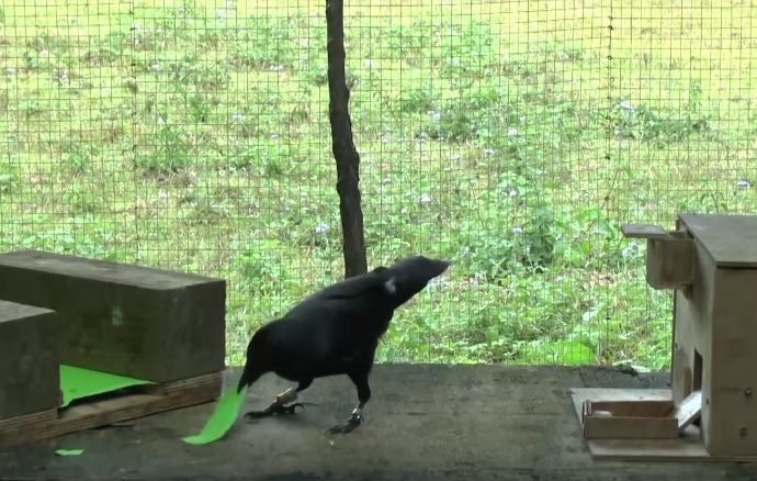 Comme le montre la vidéo publiée par les chercheurs et visible en fin d’article, pas moins de huit corbeaux ont été entraînés à déposer des morceaux de papier de taille différente dans un distributeur automatique, et suivant leur dimension, de la nourriture en sortait ou non. Après que l’entraînement eut été jugé bon, les chercheurs ont donné aux corbeaux un seul gros morceau de papier.