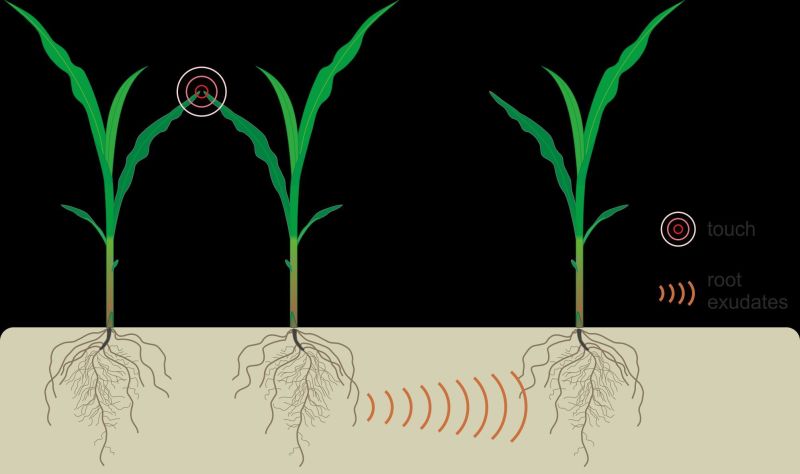 Velemir Ninkovic, de l’Université suédoise des sciences agricoles, fit cette observation sur des plants de maïs cultivés dans une solution de croissance. En brossant légèrement leurs feuilles pour simuler le contact d’une feuille de plante voisine, le chercheur enregistra alors la sécrétion de produits chimiques par les plantules de leurs racines et dans la solution de croissance. En cultivant de nouveaux semis dans ce bain infusé chimiquement, la nouvelle plante a finalement produit plus de feuilles, mais moins de racines, comparativement aux témoins. Les nouveaux semis ont donc ajusté leur croissance, produisant plus de feuilles dans le but de « ramasser » un maximum de lumière du Soleil.