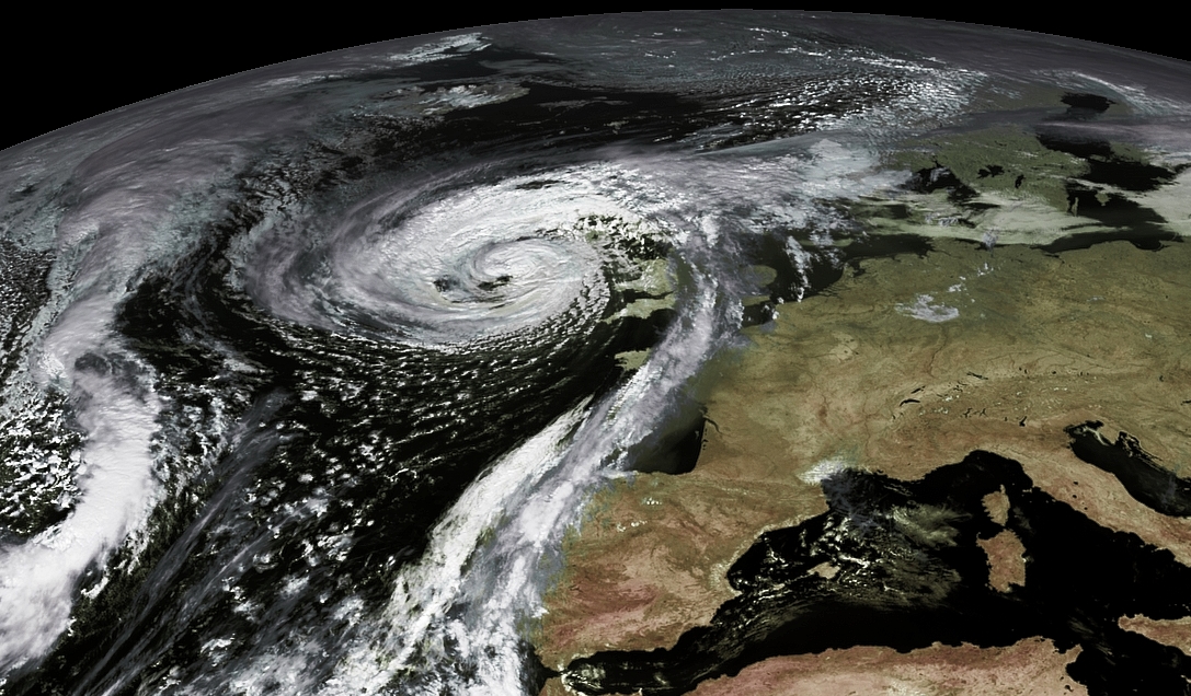 L’enroulement sombre visible au sud-ouest de l’Irlande signale l’intrusion d’air très sec venu de la haute atmosphère, dont une partie provient certainement de la basse stratosphère. Celui-ci s’engouffre en spirale autour de l’alimentation chaude et humide venue des tropiques (matérialisée par la spirale blanche) et fait partie d’un processus d’intensification non-tropical que l’on retrouve fréquemment dans les « bombes » dépressionnaires ; les dépressions qui connaissent une phase de renforcement très rapide. C’est par ce processus que l’ex-Ophelia a pu maintenir de forts vents voir même se renforcer temporairement.