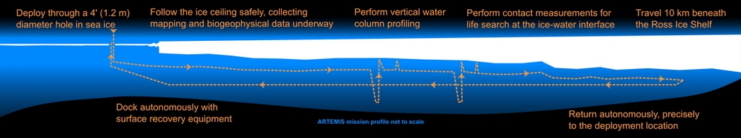 Ainsi est né Artemis, un sous-marin entièrement autonome de plus de quatre mètres de longueur pour un poids situé à 1,3 tonne. L’engin est donc massif et très résistant, notamment aux conditions les plus extrêmes. Son autonomie lui permet de se déplacer tout seul sur environ vingt kilomètres puis revenir au point de départ comme le montre le schéma ci-dessous.
