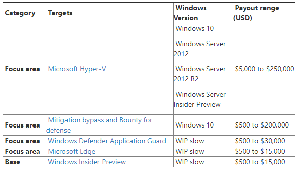 L’annonce publiée par la société précise les éléments clés du programme et identifie les versions de Windows pour lesquelles la découverte d’une faille est rémunérée. Le montant de la récompense attribuée augmente graduellement en fonction du domaine où est trouvée l’anomalie.