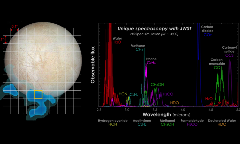 Le télescope spatial James Webb de la NASA usera de ses instruments infrarouges pour étudier les « mondes océaniques » de notre système, que sont Europe, la lune de Jupiter, et Encelade, celle de Saturne, s’ajoutant aux observations précédemment faites par les sondes Galileo et Cassini de la NASA.
