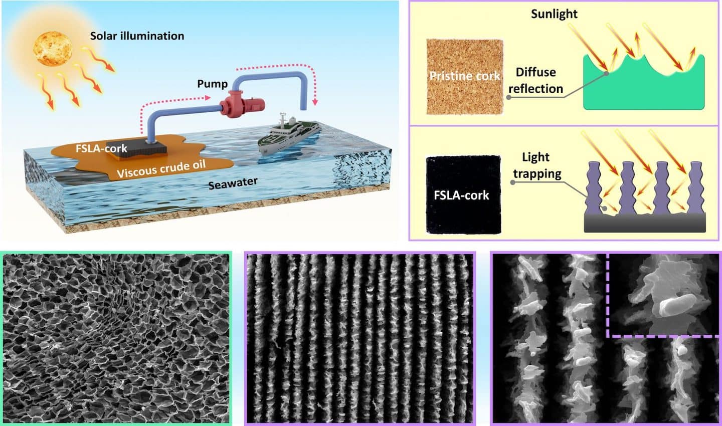 Il s’avère que la science a déjà prouvé la capacité du liège à absorber le pétrole. En revanche, plus il est épais et visqueux, plus le processus est lent. Or, avec l’aide d’un laser pour générer de petites cavités dans le liège, le matériau voit sa capacité à retenir la chaleur considérablement augmenter. Exposé à la lumière du soleil, le matériau se réchauffe et liquéfie le pétrole afin de l’absorber plus rapidement. D’après les tests des chercheurs chinois, le liège ainsi traité prend cinq fois moins de temps pour absorber les hydrocarbures.