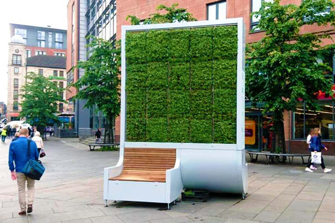Installés sous la forme d’un mur végétal, 1600 pots de mousse sont ici maintenus par une structure en acier. Des bactéries, présentes à la surface de la mousse, attirent les particules de matière polluées et les absorbent. Après cette ingestion, les bactéries meurent et servent de nourriture à la mousse. La pollution devient finalement une source nutritive. À l’heure où les arbres se font de plus en plus rares et la pollution de plus en plus présente, invisible et insidieuse, plusieurs villes en Allemagne, en Norvège, à Londres, Hong Kong et même à Paris, place de la Nation ont d’ores et déjà adopté le concept.