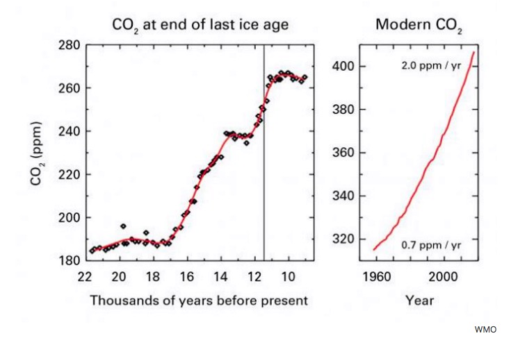 L’Organisation météorologique mondiale (OMM) mettait ce lundi en garde contre « une hausse dangereuse de la température », après avoir communiqué ces chiffres dans son bulletin annuel sur les gaz à effet de serre. La dernière fois que notre planète a connu une teneur en CO2 comparable, c’était il y a environ 3 millions d’années. Selon l’OMM, cette « montée en flèche » du niveau de CO2 est due à « la conjonction des activités humaines et d’un puissant épisode El Niño », qui se traduit par une hausse de la température de l’océan Pacifique. Alors qu’elle était de 400 parties par million (ppm) en 2015, la teneur de l’atmosphère en dioxyde de carbone aurait atteint 403,3 ppm en 2016, soit environ 145 % de ce qu’elle était à l’époque pré-industrielle, avant 1750 (le méthane et l’oxyde nitreux représentent respectivement 257 % et 122 %).