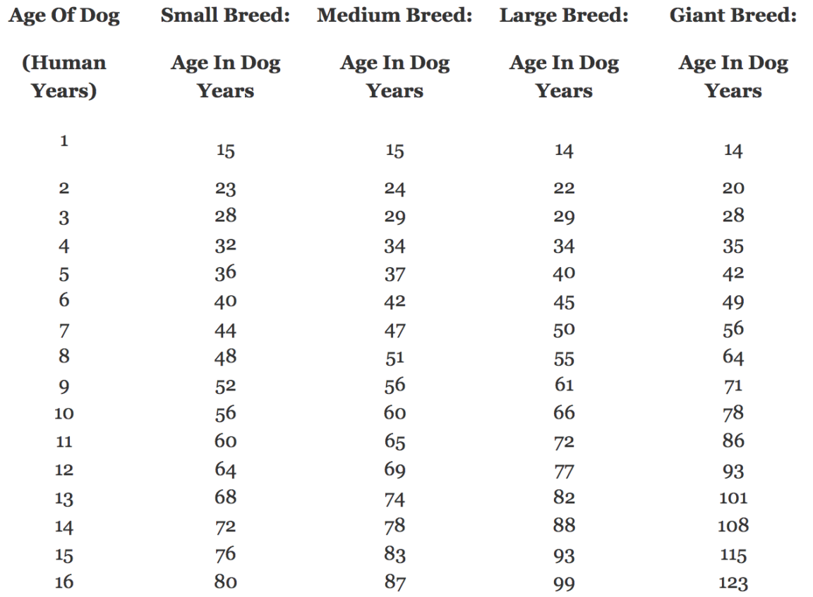 Comme vous pouvez le constater, un petit chien de 9,5 kg ou moins âgé de 4 ans aurait environ 32 ans en âge humain. Un chien de taille moyenne (9 kg – 22 kg) ou de grande taille (23 kg – 40 kg) aurait quant à lui 34 ans, quand un chien de très grande taille aurait 35 ans environ. Un petit chien âgé de 9 ans aurait en âge humain 52 ans, un chien de moyenne taille 56 ans, un chien de grande taille 61 ans et un très grand chien, 71 ans.