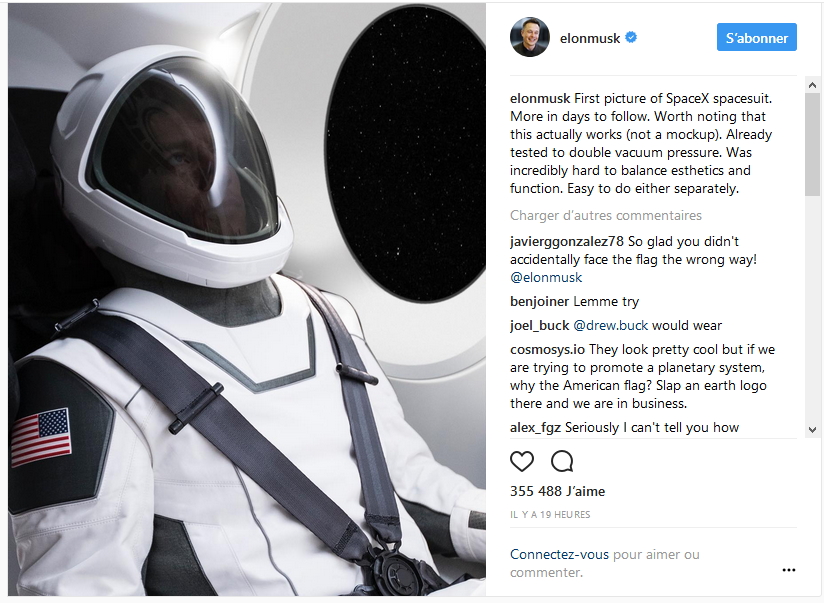 Elon Musk a également déclaré qu’il s’agissait bien d’une photo de la tenue finale et non d’un simple design comme l’atteste le message accompagnant la photo : « Déjà testée à l’épreuve de la double pression de vide. Cela a été incroyablement difficile de trouver un équilibre entre l’esthétique et les fonctionnalités techniques, ce qui est facile à faire séparément. »