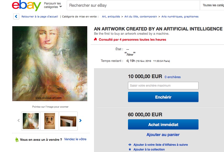 Un collectif français s’est donné la mission de confronter la créativité humaine à celle des machines, plus précisément à celle des intelligences artificielles. L’ouvre produite a d’ores et déjà été mise aux enchères sur eBay.