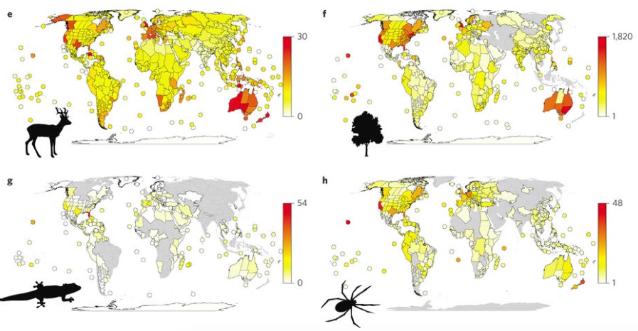 Avec son équipe de chercheurs de l’université de Durham (Royaume-Uni), l’intéressé a produit une carte mondiale (ci-dessous). Celle-ci montre les pays les plus en proie au problème des espèces vivantes invasives.