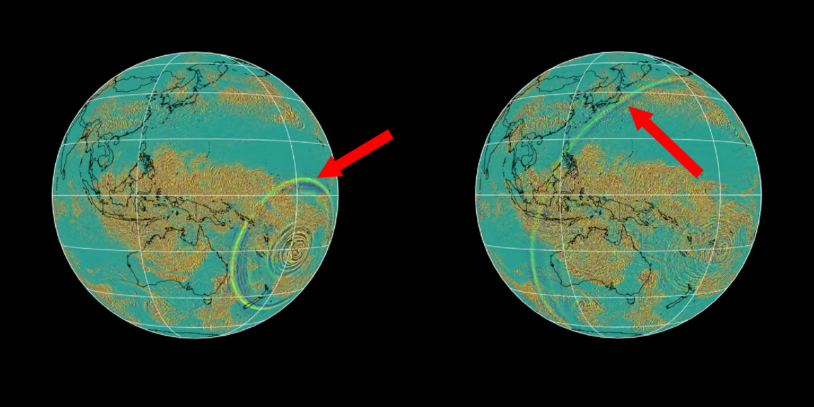 Les chercheurs se sont d’abord intéressés à l’onde principale, produite au moment du pic éruptif et qui s’est propagée trois à quatre fois autour du globe. Contrairement à ce que l’on pourrait penser, il ne s’agit pas d’une onde de choc, mais d’une onde de Lamb. Autrement dit, il s’agit d’une onde acoustique de fréquence si basse (0,01 Hertz) que l’influence de la gravité doit être prise en compte. Elle possède donc à la fois les propriétés d’une onde sonore et d’une onde de gravité.