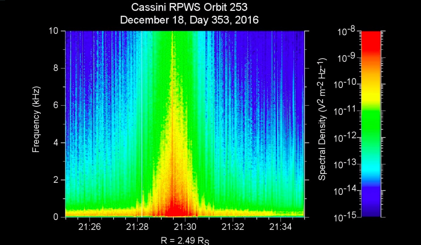 L’un de ses instruments avait déjà mesuré la densité de matière traversée en décembre dernier. Il avait alors enregistré des centaines de chocs de particules sur la sonde quand Cassini était passé juste à l’extérieur des anneaux de Saturne. Chaque poussière percutant l’antenne sonnait à l’oreille comme un crépitement ou un grésillement, mais ces derniers enregistrements sont complètement différents. Voici l’enregistrement de décembre 2016 :