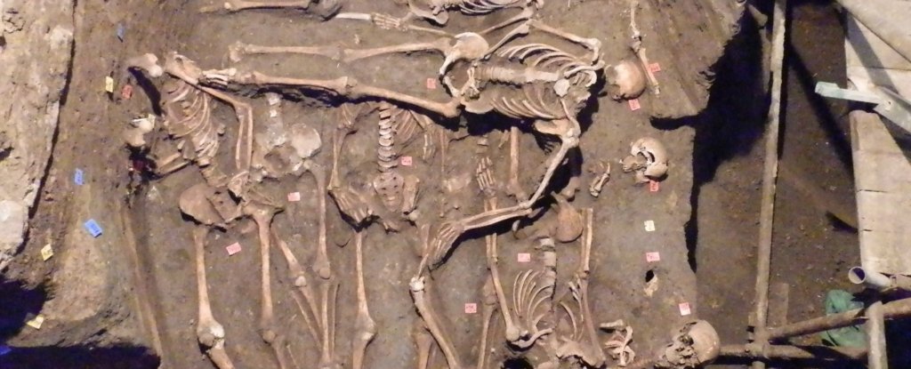 Les tombes, des fosses mesurant 2 mètres carrés pour environ 2,5 à 3 mètres de profondeur, datent de deux époques distinctes du XIVe siècle. Les chercheurs ont dans un premier temps relié les fosses les plus anciennes à une famine qui a balayé la région vers 1318. Une seconde série de fosses, plus récentes, ont été datées à 1348-1350, époque où la peste noire sévissait dans la région. Des millions de personnes sont en effet mortes à ces époques, victimes de ces maladies ravageuses ; des fosses ont été découvertes et fouillées dans toute l’Europe. Ces sépultures nouvellement découvertes n’étaient par ailleurs pas marquées. Le manque de biens funéraires — en dehors d’une poignée de pièces de monnaie et de quelques boucles de métal — indique alors que les restes ont été probablement enterrés à la hâte.