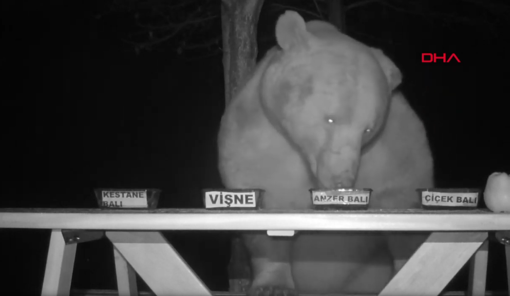 Ibrahim Sedef a sélectionné quatre miels de sa production et les a placés dans autant de récipients disposés sur une table à l’extérieur. À l’attention de l’ours chapardeur, cette douceur n’a qu’un objectif : déterminer quel miel est le meilleur. Par ailleurs, la dégustation a été immortalisée en vidéo à l’aide d’une caméra à vision nocturne (voir en fin d’article). Selon l’apiculteur, l’ours a été davantage séduit par le miel d’Anzer, un des miels les plus chers du marché !