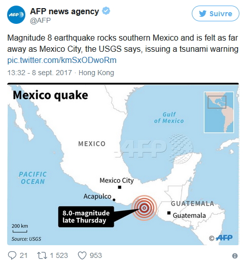 Dans la nuit du jeudi 7 septembre, un séisme d’une magnitude de 8,4 sur l’échelle de Richter est intervenu sur la côte ouest du Mexique. Son épicentre se trouvait à cent kilomètres des côtes de l’état de Chiapas et de la localité de Tres Picos selon l’Institut d’études géologiques des États-Unis (USGS). Deux décès ont été déplorés et puisque le tremblement de terre s’est produit dans l’océan, les autorités mexicaines ont déclenché une alerte tsunami.