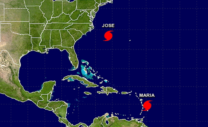 L’ouragan José qui s’est formé le 5 septembre 2017 est arrivé quelques jours après dans les Antilles, accompagné de vents allant jusqu’à 150 km/h (niveau 2). Cependant, le phénomène est toujours actif après avoir longé la côte est des États-Unis. En effet, José est désormais « bloqué » entre les Bermudes et l’état américain de Caroline du Nord et alors que celui-ci avance très lentement vers New York et Boston, l’ouragan Maria pourrait le rejoindre.