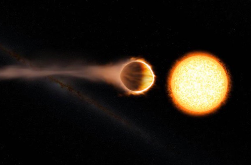 On ne remerciera jamais assez Hubble ! WASP-121b est ce que les chercheurs appellent un Jupiter chaud, une exoplanète géante de gaz. Située à environ 900 années-lumière de la Terre, WASP-121b présente la particularité de faire le tour de son étoile en seulement 1,3 jour (Jupiter orbite autour du Soleil en douze ans) et se trouve à la plus petite distance possible avant que la gravité de l’étoile ne commence à la déchirer comme l’expliquait l’Université de Genève (UNIGE) dans un communiqué du 2 août 2017. Cette proximité implique que le haut de son atmosphère (la stratosphère) se retrouve chauffé à 2500 °C environ, vaporisant ainsi la vapeur d’eau environnante.