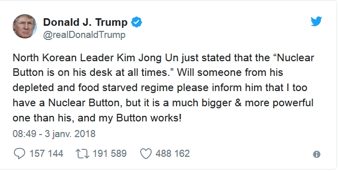 Kim Jong-Un évoquait à l’occasion de son annonce de la nouvelle année que son pays était un état nucléaire à part entière et que ce dernier avait en permanence un « bouton nucléaire » à sa disposition, sur son bureau. Par ailleurs, le président Donald Trump n’avait pas manqué de répondre à cette déclaration en indiquant avoir sous la main un bouton « plus gros et plus puissant » et « en état de marche » (voir ci-dessous).