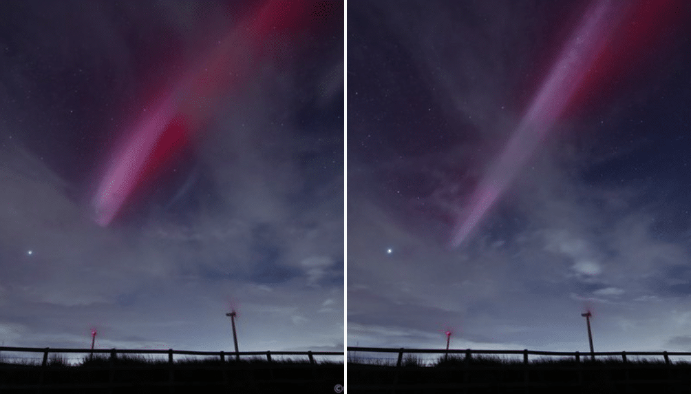 La teinte pourpre distinctive du STEVE provient de ce flux de plasma atteignant des températures de 3000 degrés Celsius, se déplaçant à des vitesses dépassant les 20 000 km/h. Si le ton est plus faible et tend vers le rouge, il est alors appelé SAR (Stable Auroral Red). Les SAR peuvent évoluer en un STEVE, comme l’a également observé Martin McKenna.