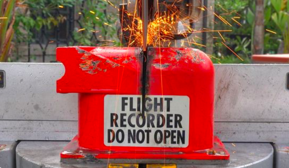 Pour le bien de l’expérience et recréer les conditions réelles d’un crash, ils ont lancé une boîte noire dans le désert depuis un hélicoptère. Une fois celle-ci récupérée, ils l’ont coupé en deux à l’aide d’une scie circulaire.