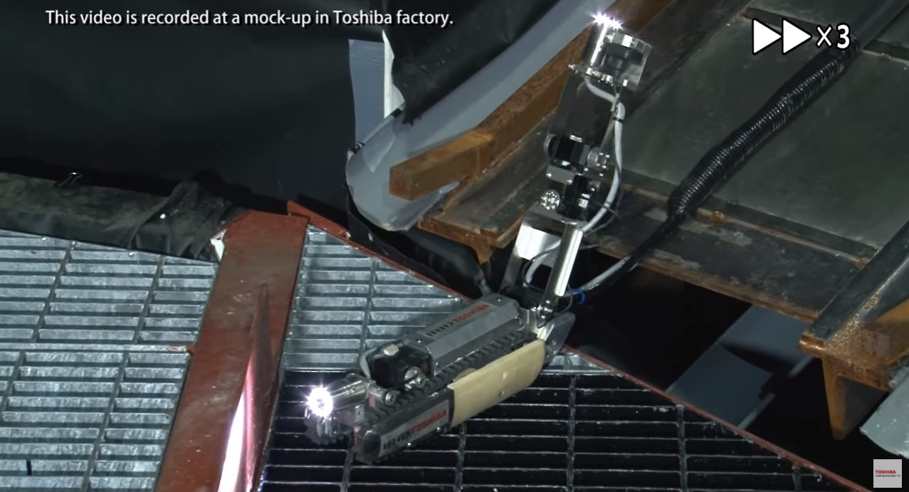 Pendant la séance de test dans les labos de Toshiba, le robot scorpion a d’abord glissé dans un conduit, puis il a rampé à travers une petite brèche et il est arrivé sur une plateforme de métal. Il a ensuite soulevé sa queue pour regarder au bout de la tige de commande de conduite, une structure sur laquelle un peu de combustible fondu aurait pu être laissé.