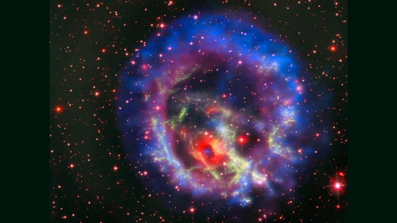 1E 0102.2-7219 ne serait pas si coloré si vous pointiez votre télescope dessus. Les astronomes ont ici combiné les données de plusieurs télescopes. Ce qui nous importe ici, c’est l’anneau vert et rouge causé par la lumière émise par les atomes d’oxygène et de néon. Au centre de cet anneau se trouve un point de rayons X, trahissant la présence d’une étoile à neutrons de seulement 8,7 kilomètres de diamètre. Vous retrouverez tout ce beau monde à environ 200 000 années-lumière de la Terre.