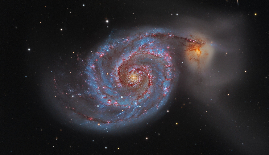 La galaxie du Tourbillon (ou M51) est un couple de galaxies situé à plus de 27 millions d’années-lumière de notre planète dans la constellation Chiens de chasse. Si la galaxie principale a été découverte par l’astronome français Charles Messier, la seconde galaxie a quant à elle été découverte légèrement plus tard par un autre astronome français, à savoir Pierre Méchain en 1781.