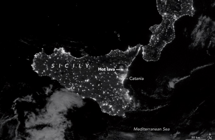 Dans une nouvelle image satellite récemment publiée, la Sicile est illuminée de nuit par la lumière des villes qui la composent, mais également par la lace chaude de l’Etna récemment entré en éruption.