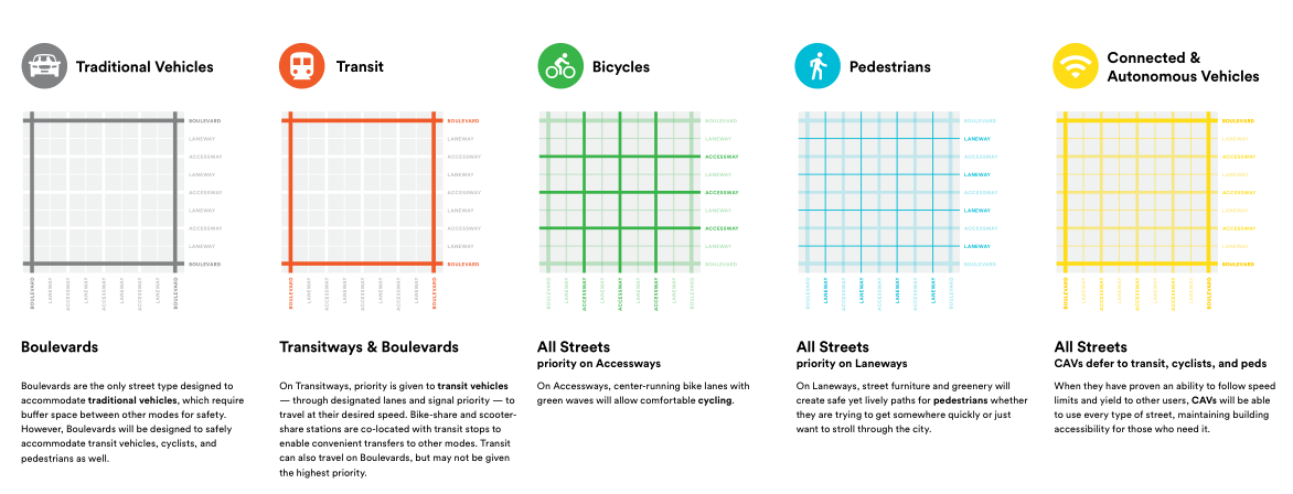 Durant les heures creuses, le bloc se transformerait en une zone calme et reposante. Sidewalk Labs pense à y autoriser seulement des véhicules autonomes électriques roulant à une vitesse maximale de 8 km/h. Ainsi, piétons, vélos, et véhicules silencieux y auraient leurs droits, et ce même sur les axes autorisant les véhicules habituels. Tout ces petits changements qui se produiraient au fil des heures seront gérés par des algorithmes d’apprentissage automatique.