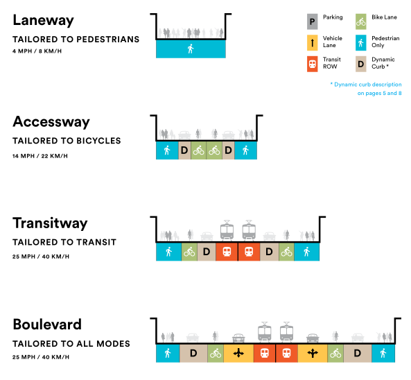 Outre le schéma basique propre à chaque bloc, les voies de circulation seraient parcourues par des lampes LED. Celles-ci auraient pour mission de faire apparaître une couleur autorisant les piétons ou certains véhicules. Également, il peut s’agir d’un élargissement (ou un rétrécissement) de la chaussée en fonction des heures. Il serait question de donner la priorité aux transports en commun durant les heures de pointe. Simplement privilégier une voie ou une autre suivant la congestion du trafic fait aussi partie des possibilités. Dans le cas de la ville de Toronto, des trottoirs chauffants pourraient être aménagés lorsque la neige est abondante, le but étant là encore de faciliter le transit.