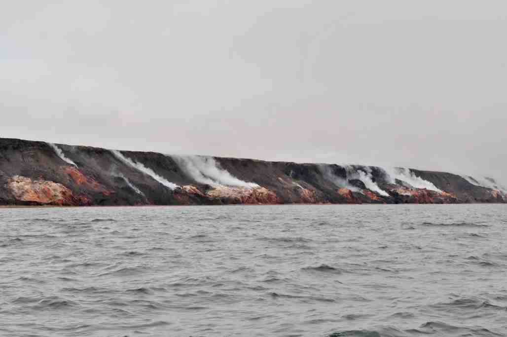 « Quand on approche par la mer, on découvre sur des dizaines de kilomètres des panaches de fumée, certains isolés et espacés, d’autres groupés en rideaux. Ces fumerolles sont-elles volcaniques ? Absolument pas. Il s’agit de la combustion spontanée de lignite (ou houille brune) qui suite à des éboulements s’est embrasée grâce à des sulfures provenant de bactéries au contact de l’oxygène ! »