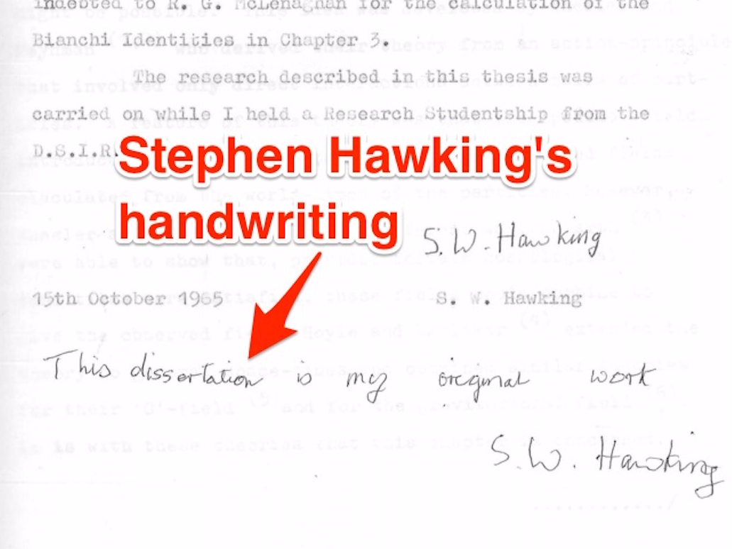 Ce texte, que vous retrouverez en intégralité ici, traite des implications et des conséquences de l’expansion de l’Univers, examinant notamment les perturbations d’un univers homogène et isotrope en développement. Un timbre officiel de l’Université de Cambridge date le document au 1er février 1966, l’année où Hawking reçut son doctorat. À l’époque, le physicien commençait à souffrir de la maladie de Charcot. Il était cependant encore capable d’écrire et de signer lui-même son papier. Plusieurs pages présentent également des équations mathématiques complexes qui ont été écrites à la main.