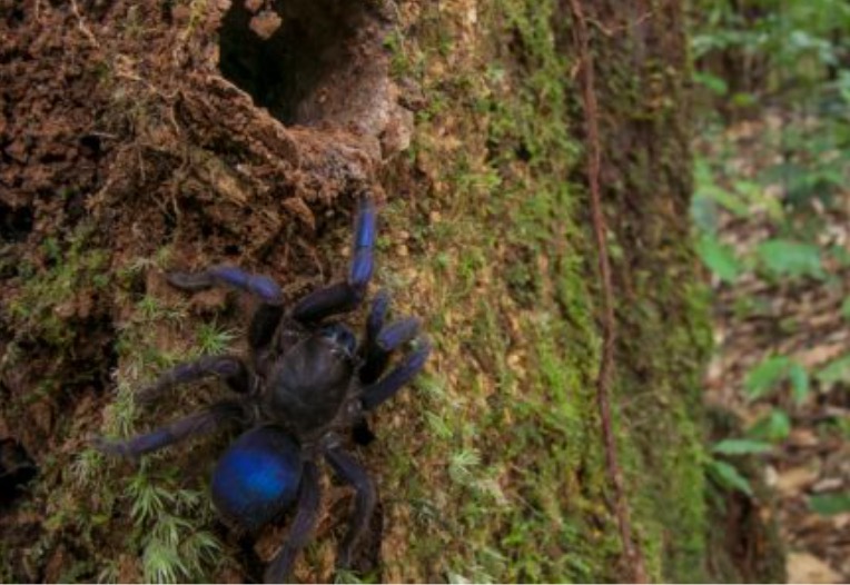 Il y a quelques semaines lors d’une randonnée nocturne en pleine forêt tropicale, le long de la partie supérieure de la rivière Potaro, en Guyana, l’herpétologiste Andrew Snyder soulevait une souche d’arbre pourrie. Il vit alors de nombreux trous. Il prit alors sa lampe torche et dans l’un de ces trous se révéla une tarentule visiblement non décrite. Elle était bleue. D’autres tarentules de la même espèce occupaient les autres petits trous, laissant imaginer qu’il pourrait s’agir d’une espèce sociale, ce qui est inhabituel chez les tarentules.
