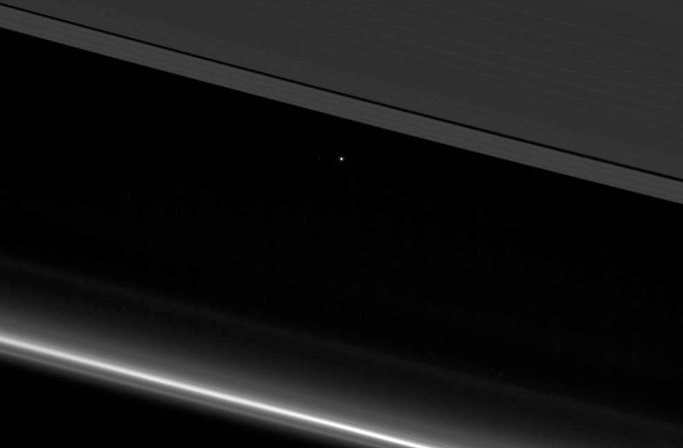 C’est le 12 avril dernier, à quelques 1,4 milliard de kilomètres de la Terre (au cœur des anneaux de Saturne) que la sonde Cassini a capturé cette image exceptionnelle nous montrant en tout petit la Terre et la Lune. Bien que ce soit bien trop petit pour être vu sur l’image, la partie de la Terre qui faisait face à Cassini au moment de la capture de la photo était le sud de l’Océan Atlantique selon la NASA. La Lune n’est visible que dans la version zoomée de l’image, sur la gauche de notre planète brillante.