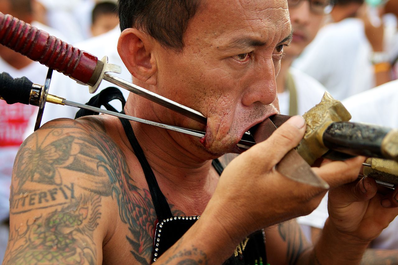 Chaque année se déroule à Phuket en Thaïlande un festival très spécial. En effet, visiteurs et habitants assistent à d’étranges rituels d’auto-mutilation. Cet événement est en réalité un festival végétarien peu recommandable aux cœurs fragiles.