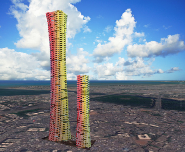 Des containers empilés pour constituer deux gratte-ciels colorés, voici l’idée. Comme il est visible sur les images, les façades en forme de cylindre et les différentes couleurs ne sont pas un hasard : elles prennent en compte l’exposition au soleil afin de réguler la température intérieure des buildings. Le plus grand des deux bâtiments (400m de hauteur) pourrait loger quelque 1400 familles soit environ 5000 personnes dans les 2344 containers recyclables prévus dans le projet. Le second, plus petit, verrait sa capacité divisée par deux.