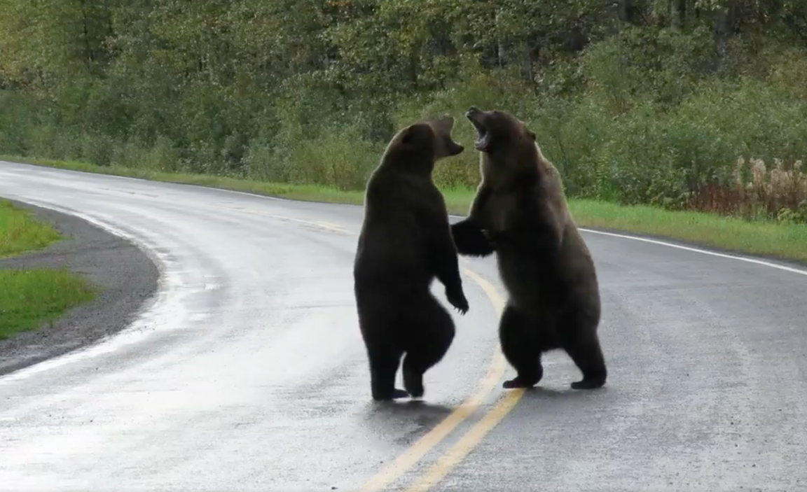 Il y aurait en Amérique du Nord entre 30 000 et 45 000 grizzlis (Ursus arctos horribilis). Pas étonnant donc d’en apercevoir sur les bords de routes. Ils sont en revanche la plupart du temps solitaires. Pouvoir assister à un combat entre deux spécimens est donc très rare. L’une de ces « querelles » a néanmoins pu être filmée par Cari McGillivray il y a quelques jours, alors qu’elle roulait dans le nord-ouest de la province de Colombie-Britannique.