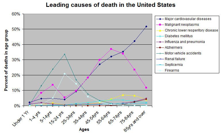 Quelques données significatives : 80% des hommes âgés de 20 ans sont morts de « causes externes » dont les armes à feu (10% des hommes tous âges confondus) mais une étude datant de 2014 montrait que les trois plus importantes causes de décès sont incarnées par l’infarctus du myocarde, les accidents vasculaires-cérébraux et les affections pulmonaires. Le graphique est donc à prendre avec des pincettes pour certaines données.