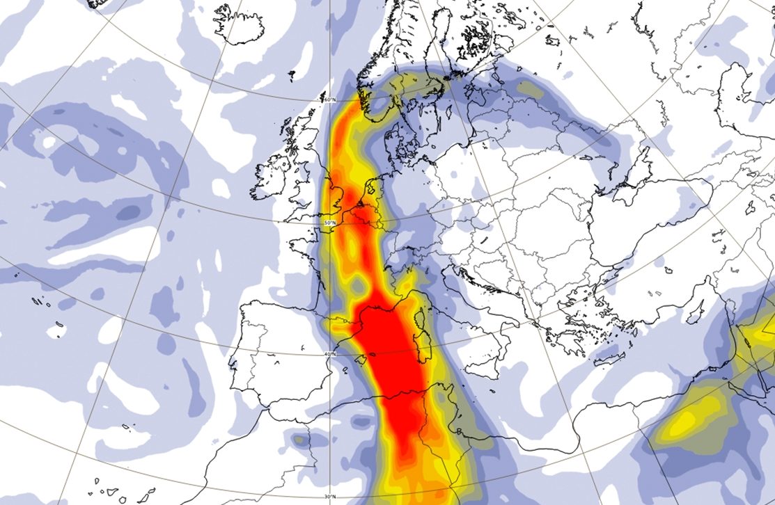 À peine deux semaines plus tard, les choses semblent vouloir se répéter. Et pour cause, le flux perturbé situé sur le proche atlantique s’est à nouveau déporté très bas en latitude – jusqu’au sud du Maroc. L’important panache de poussière actuellement présent en Afrique de l’ouest va être aspiré à l’avant de la dépression et propulsé jusqu’en Scandinavie par un puissant flux de sud à sud-ouest. Si l’on considère la quantité de sable mobilisée, l’épisode attendu s’avère plus important que celui du début de mois.