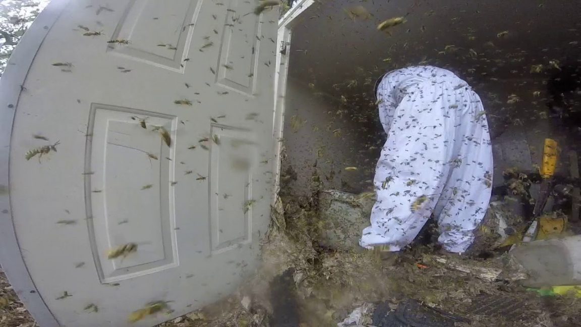 Si vous avez peur des insectes volants, passez votre chemin. Jude Verret, apiculteur depuis 20 ans et exterminateur agréé depuis 12 ans, publiait il y a quelques jours sur sa chaîne YouTube une série de vidéos montrant la destruction d’un gigantesque nid de guêpes, à Patterson, en Louisiane, aux États-Unis. L’énorme colonie s’était installée dans un cabanon de jardin. Dans cette vidéo filmée avec une caméra GoPro, l’homme nous montre l’étendue du nid, construit à partir de fibres végétales mâchées, collées minutieusement jusqu’à ce qu’elles ressemblent à une pile de carton recyclé. Ici tout est englouti, fait partie des fondations, des boîtes de rangement aux outils de jardinage. L’extermination du nid aura au total duré 45 minutes.
