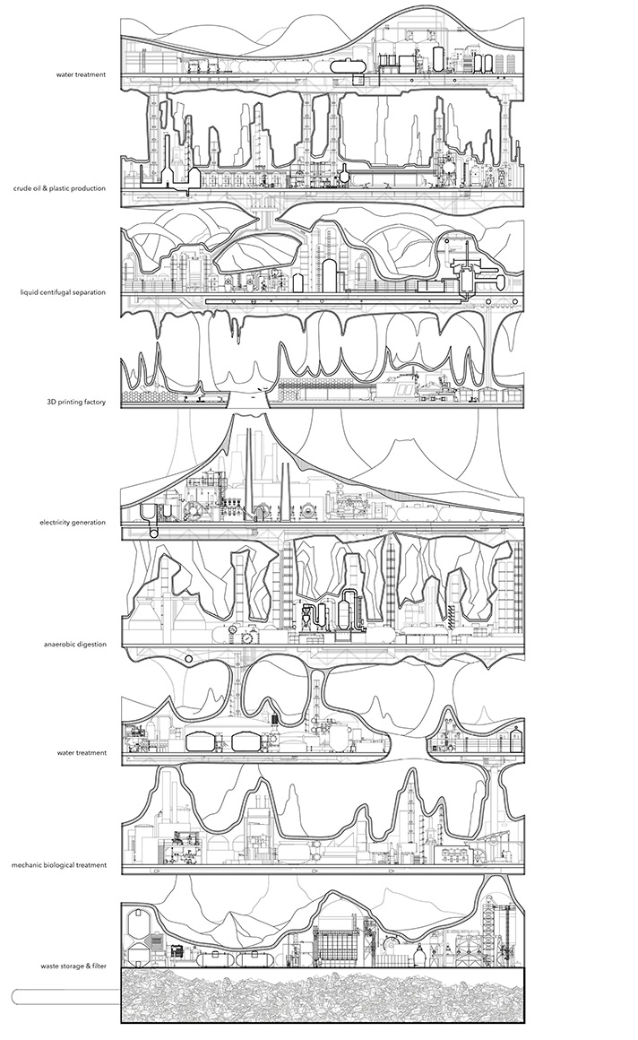 Il s’agit d’une sorte de gratte-ciel qui n’a absolument pas l’air d’un bâtiment classique. En effet, le but est ici de découper les usines de manière stratégique et d’empiler les morceaux les uns sur les autres afin de mettre au point un processus de transformation des déchets en nouveau paysage de la ville. Les déchets en question seront traités et transformés au niveau inférieur de l’édifice industriel en eau, engrais, électricité ou encore chaleur.
