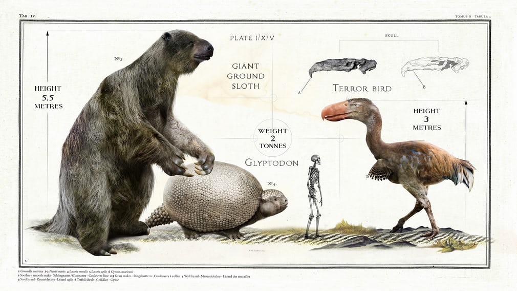 Dans la photo qui illustre l’article, vous pouvez observer le paresseux terrestre géant de l’ère glaciaire (Megatherium), qui disparut de la surface de la Terre il y a environ 11 000 ans. Il pouvait atteindre les 5,5 mètres de hauteur. Pendant ce temps, le Glyptodon, un parent préhistorique du tatou moderne – se rapprochait plus de la coccinelle (la voiture). Il serait apparu il y a 30 millions d’années pour finalement disparaître il y a environ 10 000 ans avec l’arrivée de l’Homme sur le continent sud-américain. Le « Terror Bird’, de l’ère cénozoïque, pouvait de son côté atteindre les trois mètres de haut. Il était l’un des plus grands prédateurs de son époque.