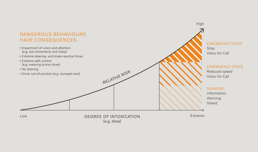 Les réactions du véhicule prendront la forme de signaux d’avertissement. Dans le cas où le conducteur ne prend pas en compte ces mêmes signaux, une réduction automatique de la vitesse sera appliquée. Dans des situations plus extrêmes, le système prendra le contrôle total du véhicule afin de le garer dans une zone sécurisée et ainsi l’immobiliser. Le service d’assistance Volvo on Call pourrait être également alerté.