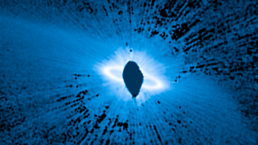 « Les images révèlent sans ambiguïté l’anneau de débris intégré dans une structure de diffusion exo-anneau beaucoup plus grande, morphologiquement complexe et biaxialement asymétrique », ont écrit les chercheurs dans un article publié récemment dans The Astronomical Journal. En d’autres termes : c’est massif et bizarre. Plus étendue dans un sens que dans l’autre, la structure semble donc plus « écrasée » d’un côté. Cela peut être dû au mouvement de l’étoile hôte qui traverse le milieu interstellaire, comme la vague d’étrave d’un bateau traversant un lac. Les chercheurs soupçonnent également la présence d’un remorqueur : le compagnon binaire de l’étoile (HR 4796B), situé à environ 86 milliards de km de l’étoile primaire.